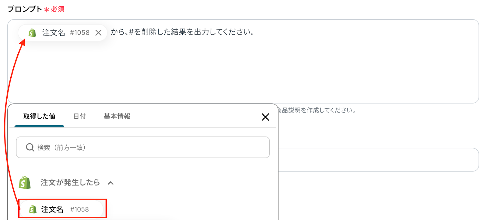 続いて、詳細設定の画面で、「プロンプト」を設定してください。