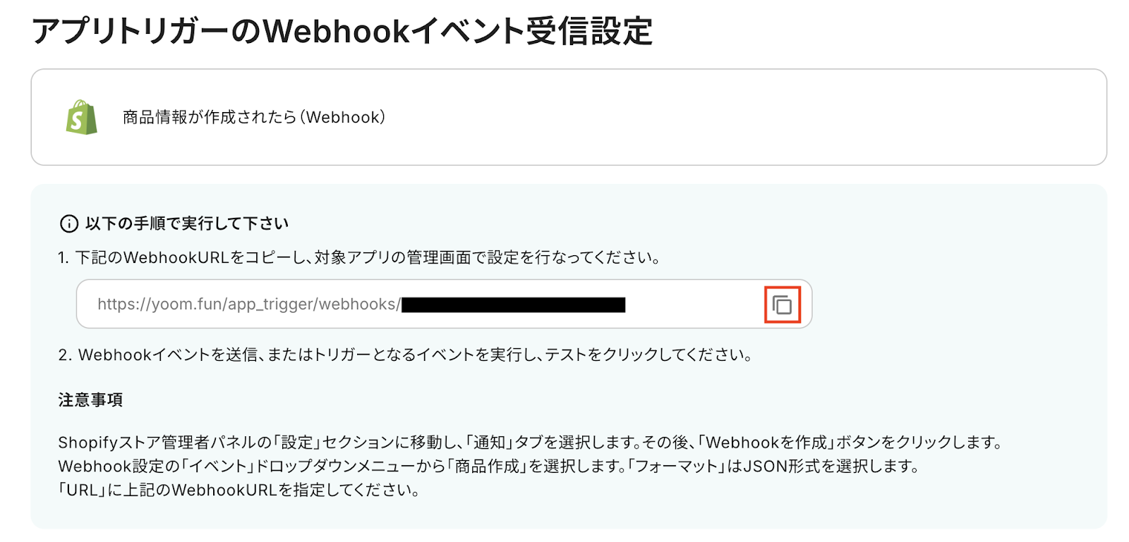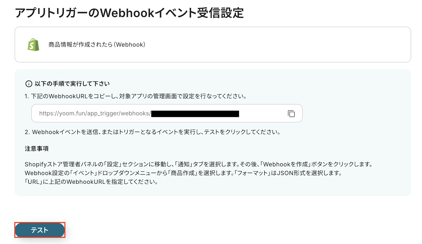 これを行うことで、Shopifyで新しい商品情報が作成された際、その内容がWebhookを通じて自動的に通知され、Yoom側で処理が開始できるようになります。
