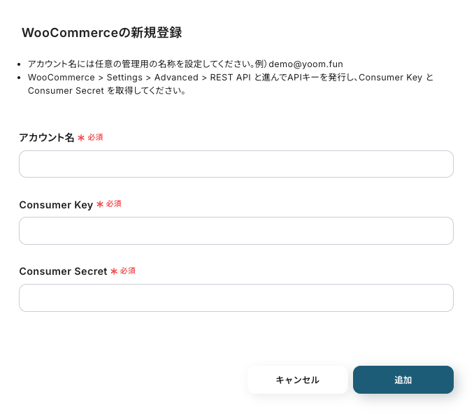 アカウント名、Consumer Key、Consumer Secretをそれぞれ入力のうえ、「追加」をクリックします。