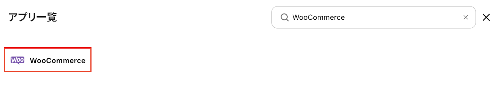 新規接続をクリックしたあと、アプリのメニュー一覧が表示されるのでWooCommerce と検索し対象アプリをクリックしてください。