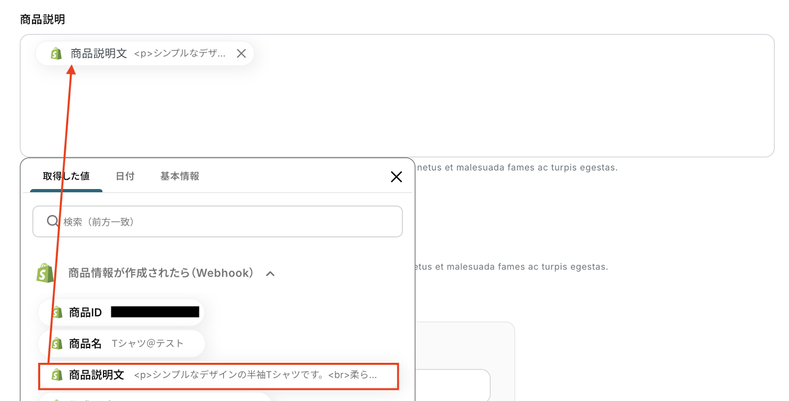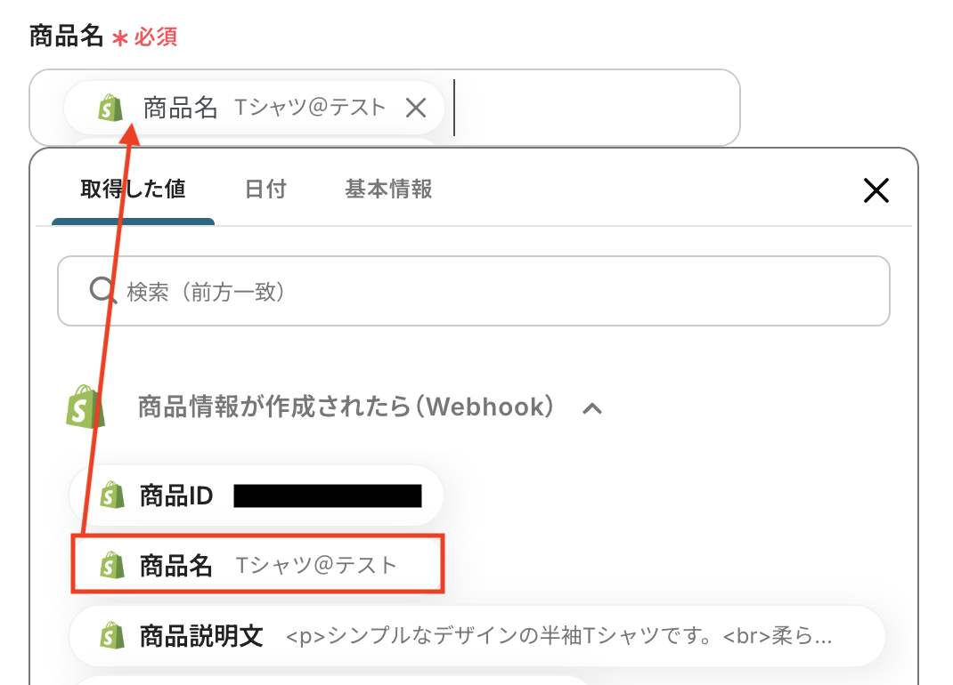 これらの入力欄には、固定の値を直接指定することも、Shopifyの商品データから取得したアウトプットを割り当てることも可能です。