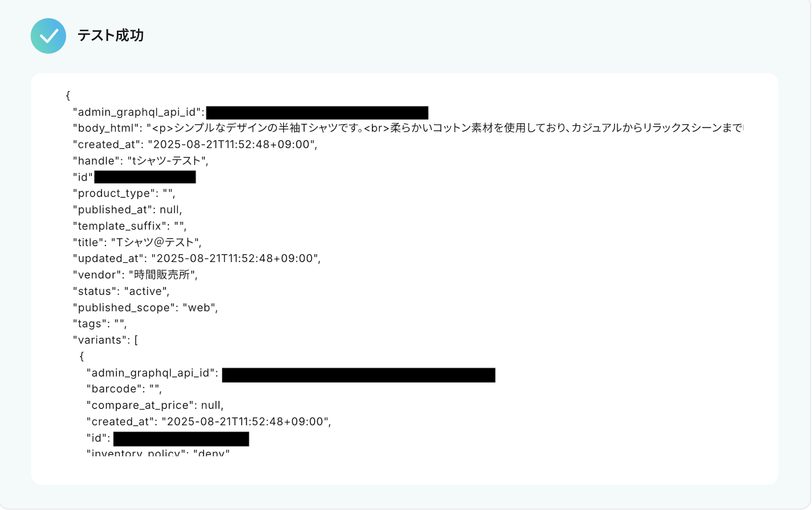 テストに成功すると、Shopifyに作成された商品情報に関する情報が一覧で表示されます。