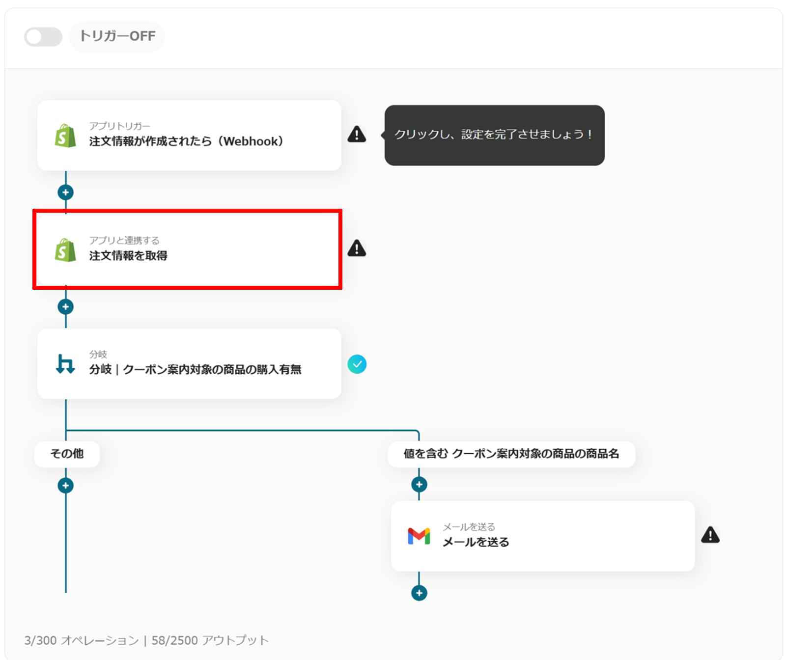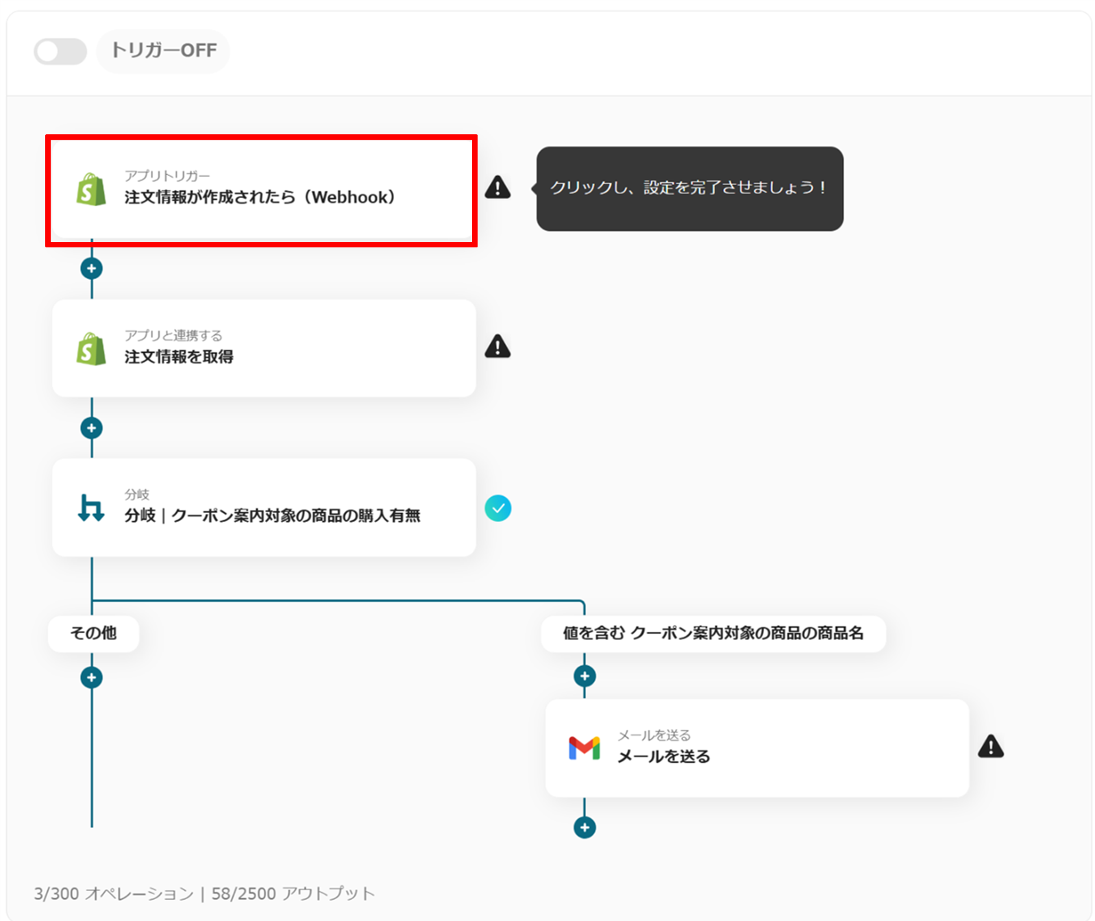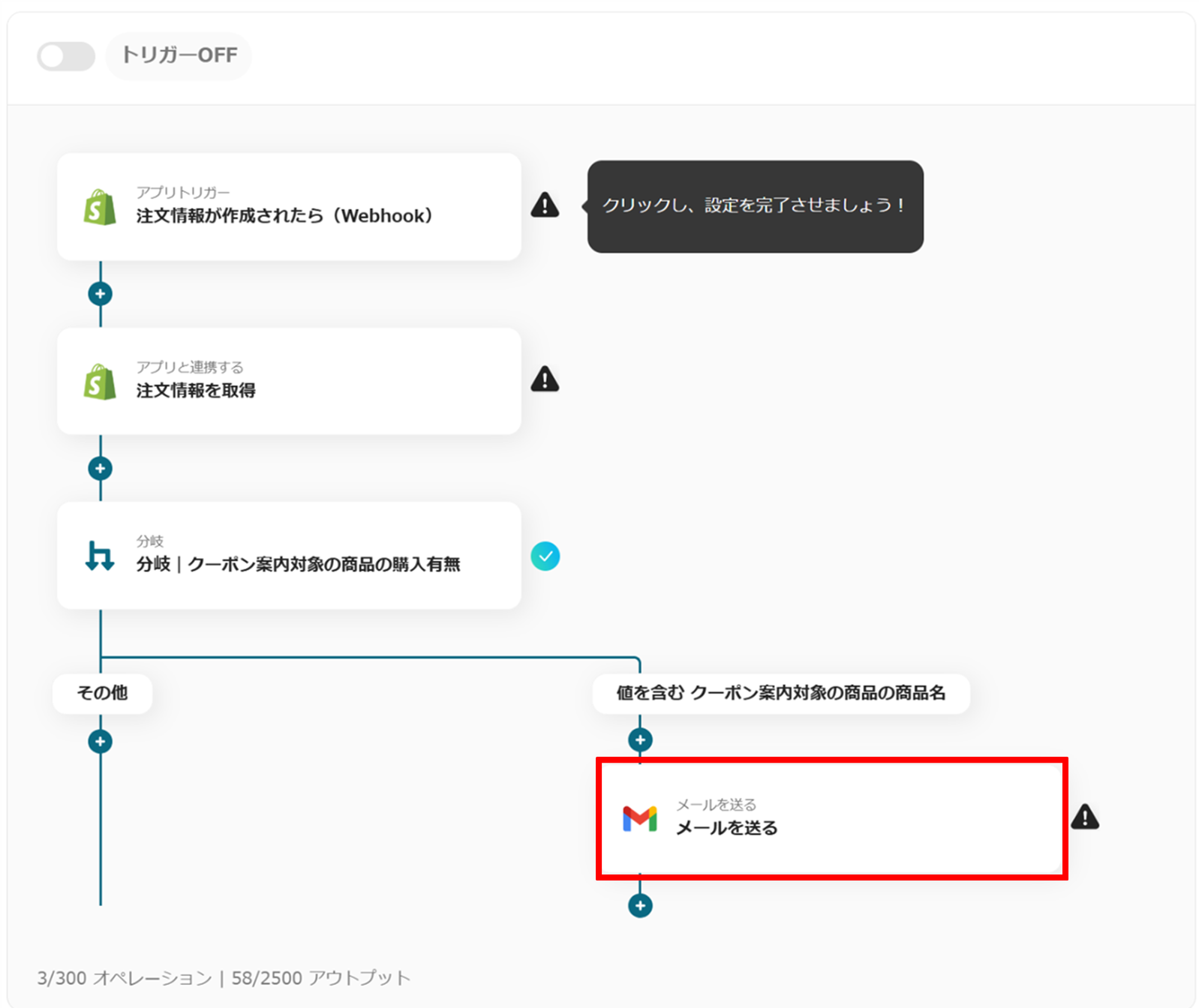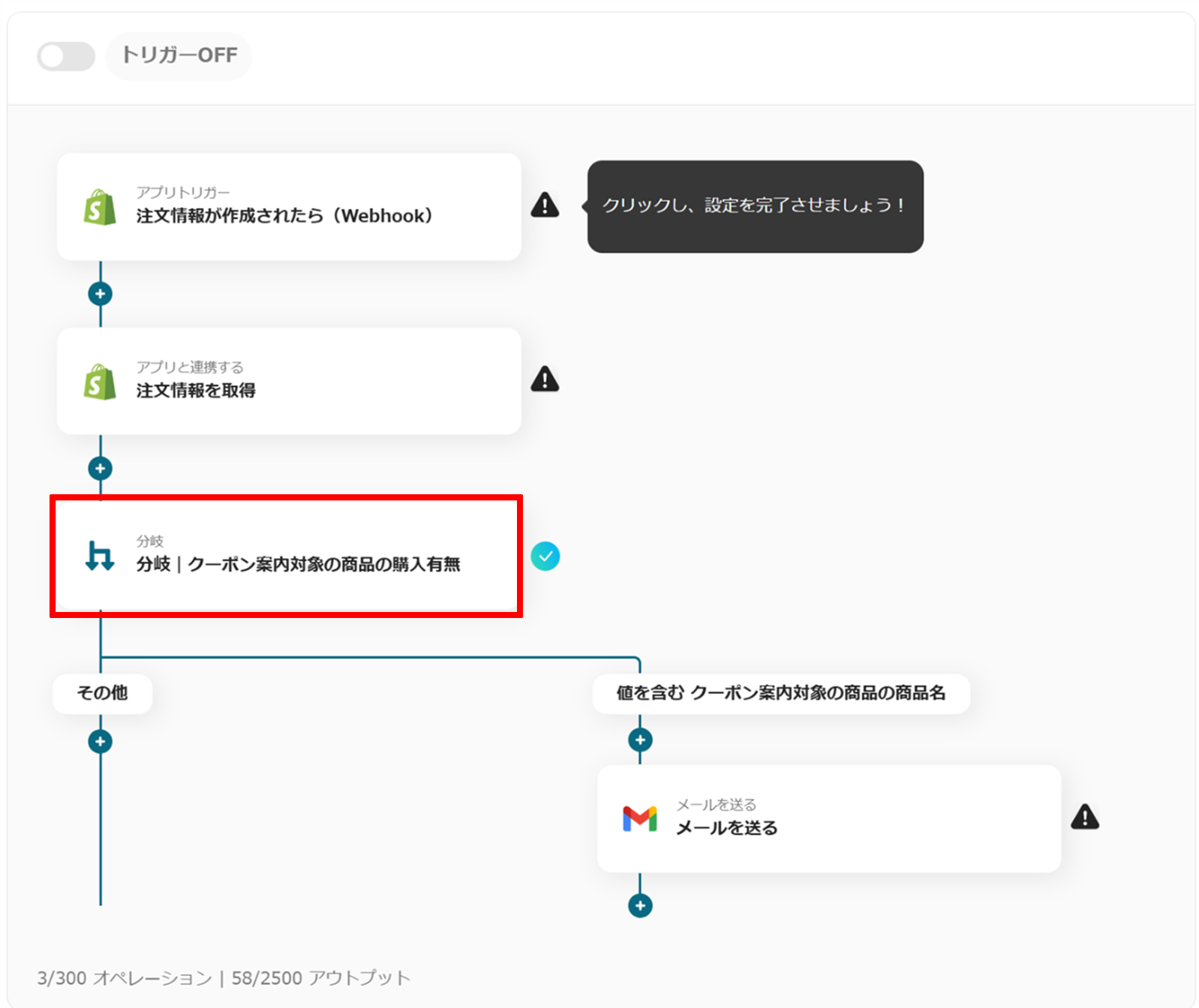 これで、「Shopifyで特定の商品の注文が発生したらGmailでクーポン情報を送信する」フローボットの完成です。
