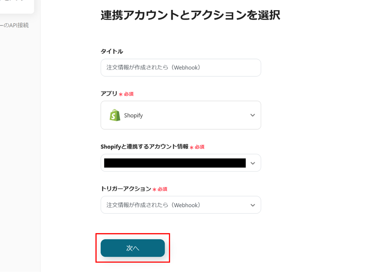 (2)Shopifyの「連携アカウントとアクションを選択」画面から、Shopifyと連携するアカウント情報に誤りがないかを確認し、トリガーアクションは「注文情報が作成されたら(Webhook)」のままで「次へ」をクリックします。