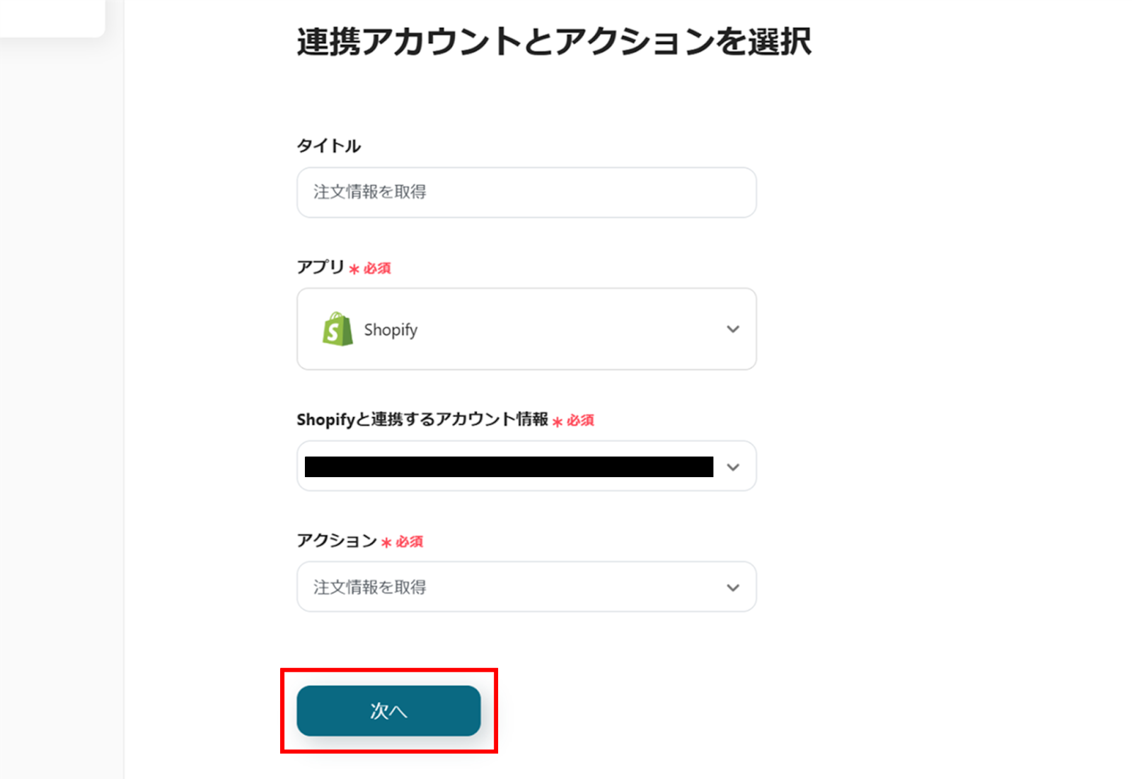 (5)「連携アカウントとアクションを選択」画面から、Shopifyと連携するアカウント情報に誤りがないかを確認し、アクションは「注文情報を取得」のままで「次へ」をクリックします。