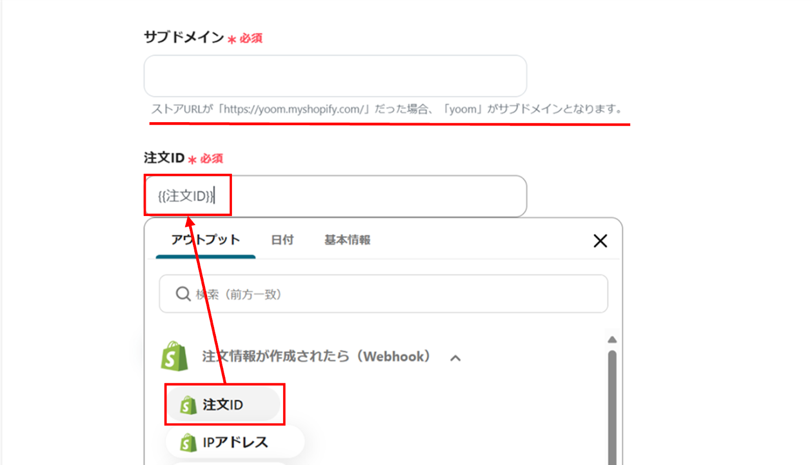 注文IDはアウトプットから選択します。
