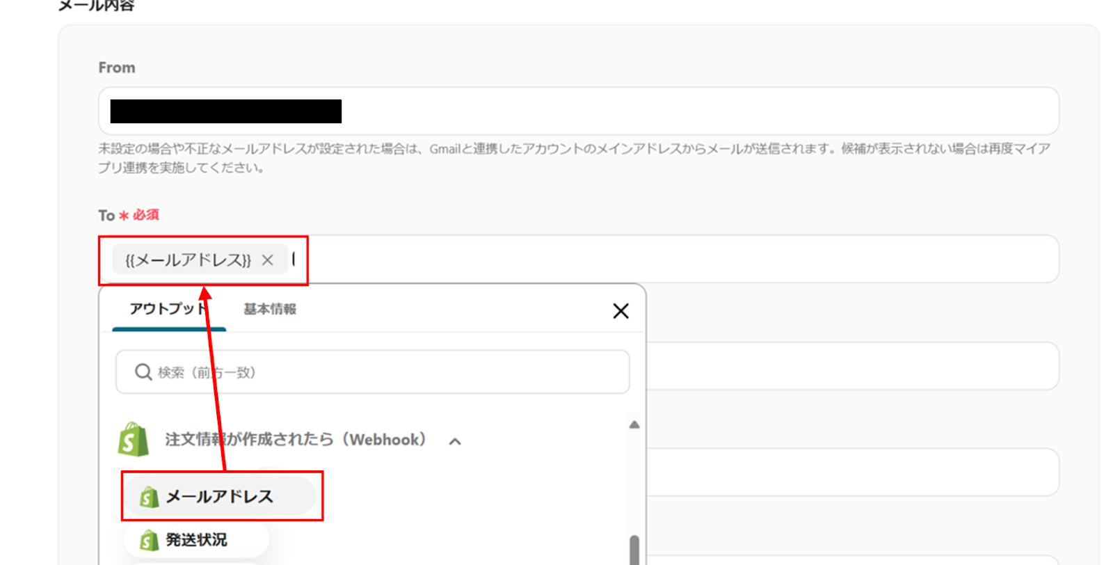 下へ進み、メール内容からメールアドレスをアウトプットから選択します。