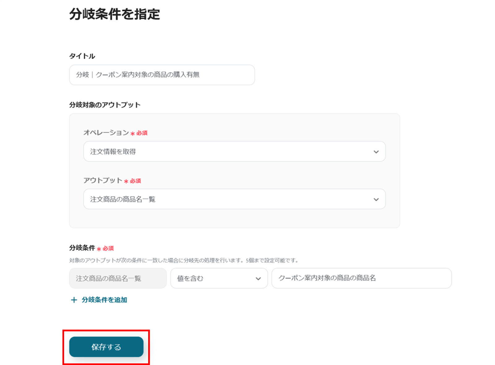 分岐条件を追加したい場合は「+分岐条件を追加」をクリックすることで、追加できます。