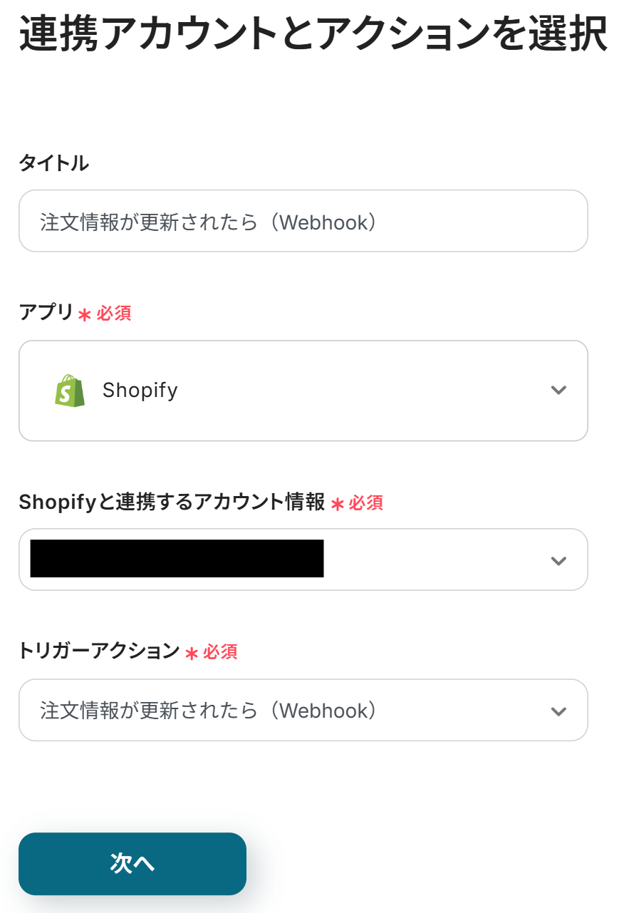 以下の画面が表示されたら、「タイトル」を確認してください。 使いやすいようにタイトルを変更することも可能です。 最初に、Shopifyの注文ステータスがキャンセルになったらフローボットを起動する設定を行うため、「注文情報が更新されたら(Webhook)」をクリックします。