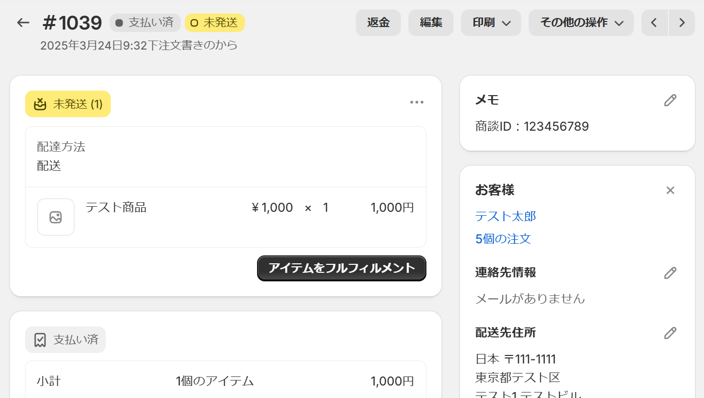 そのままテスト用に注文情報を作成し、注文をキャンセルしておきましょう。 あらかじめGoogle スプレッドシートに入力していた商談IDをメモ欄に記載してください。 今回は以下のように設定しましたが、設定内容は任意です。 設定が完了したらYoom画面に戻り、「テスト」をクリックします。