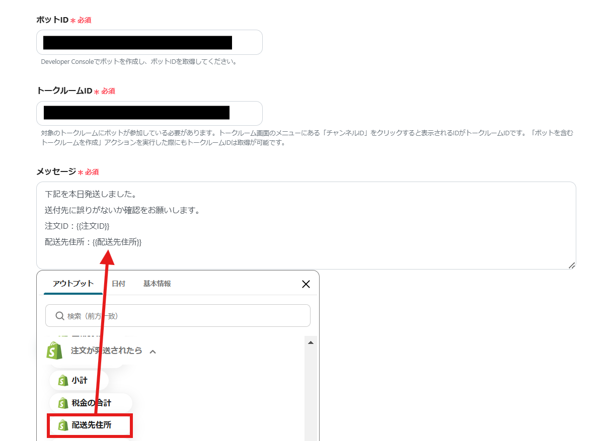 メッセージは編集欄をクリックすると、以下の画面のようにShopifyで取得した情報を引用できます。