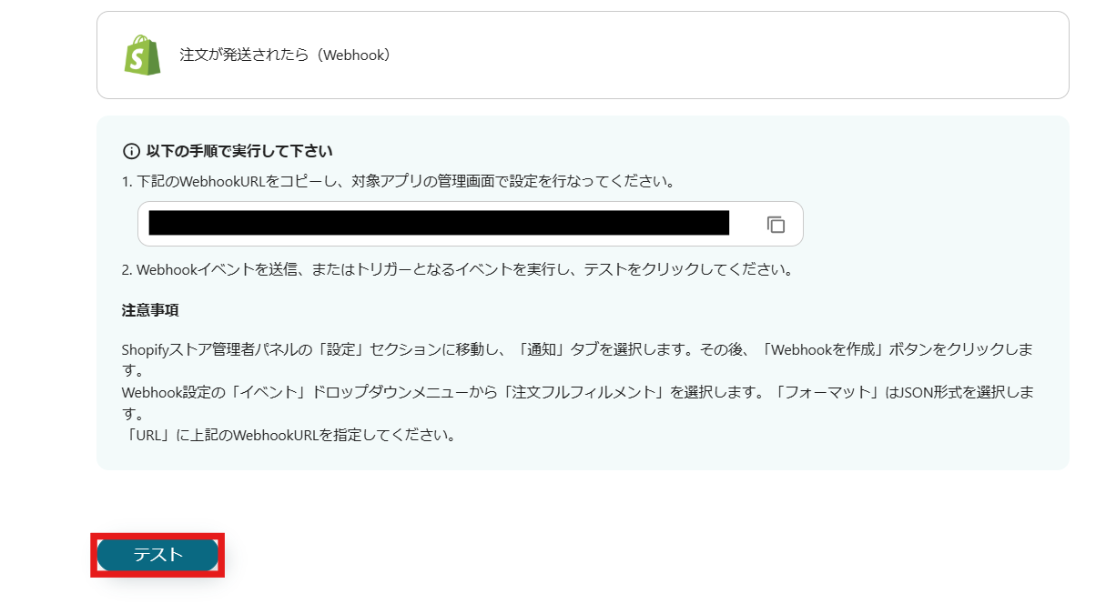 3.WebhookURLをコピーし、Shopifyの管理画面で設定を行ってください。