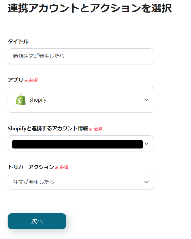 トリガーアクションは変更できないので、アカウント情報を確認したら次に進みます。