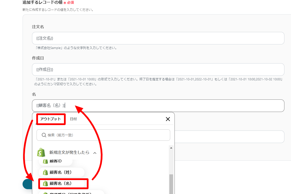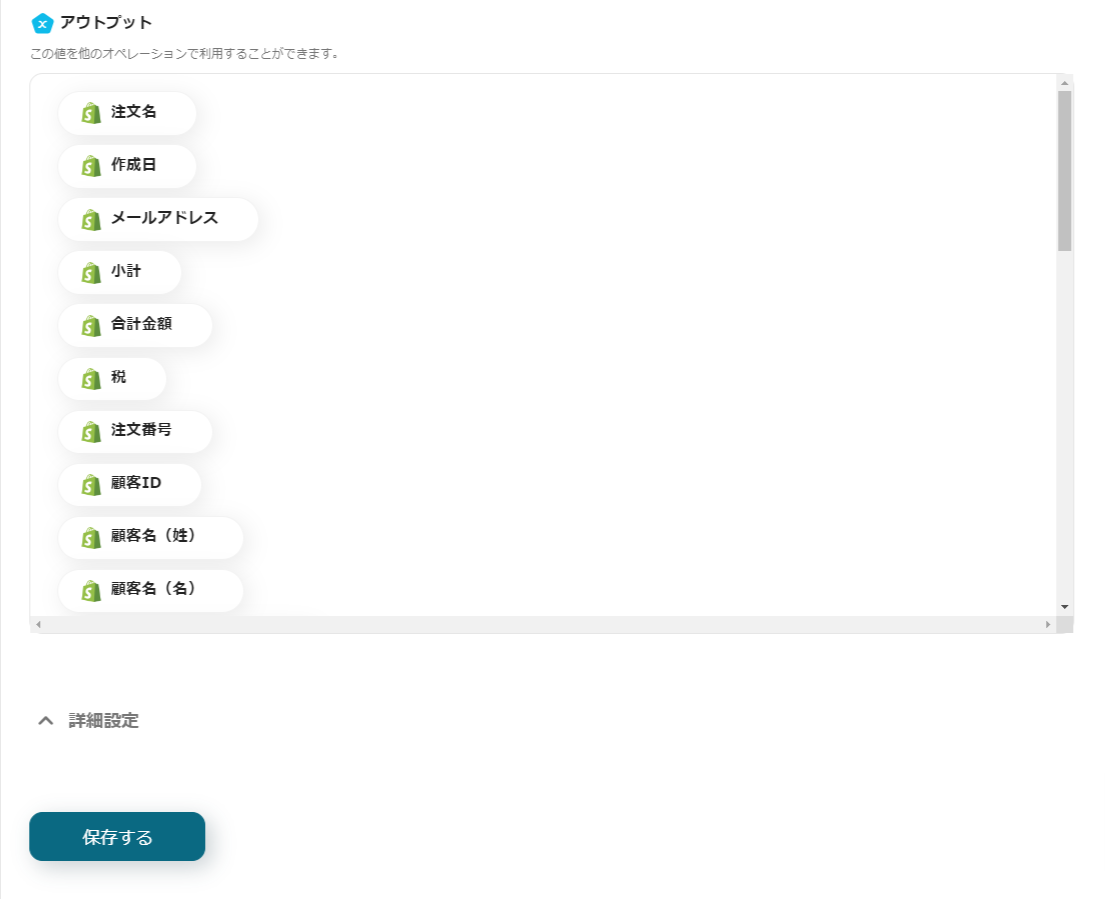 Shopifyの設定で取得したアウトプットを、あてはまる項目で選択していきましょう。