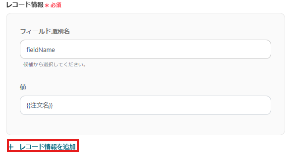上記の画像では、注文名を登録するような設定になっていますが、他にも複数の値を登録したい場合は、「+レコード情報を追加」をクリックすると、新しい入力ボックスが作成されます。