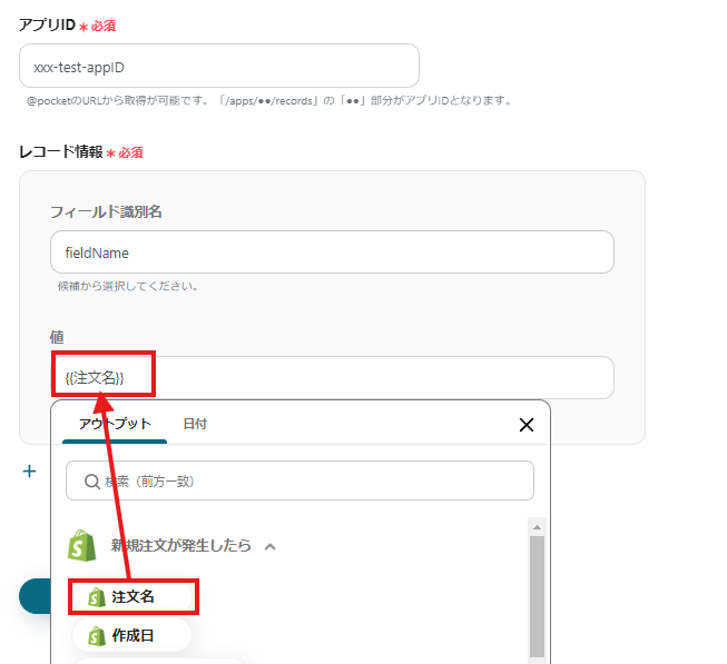 レコード情報の値は、Shopifyからアウトプットされた情報を活用して入力しましょう。