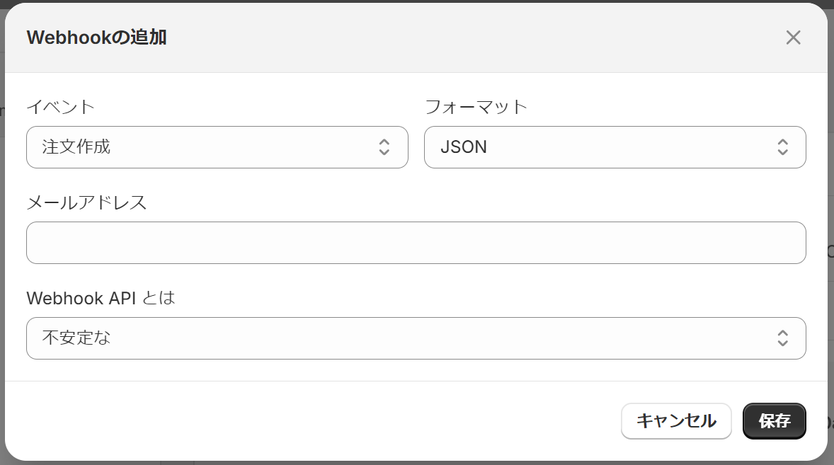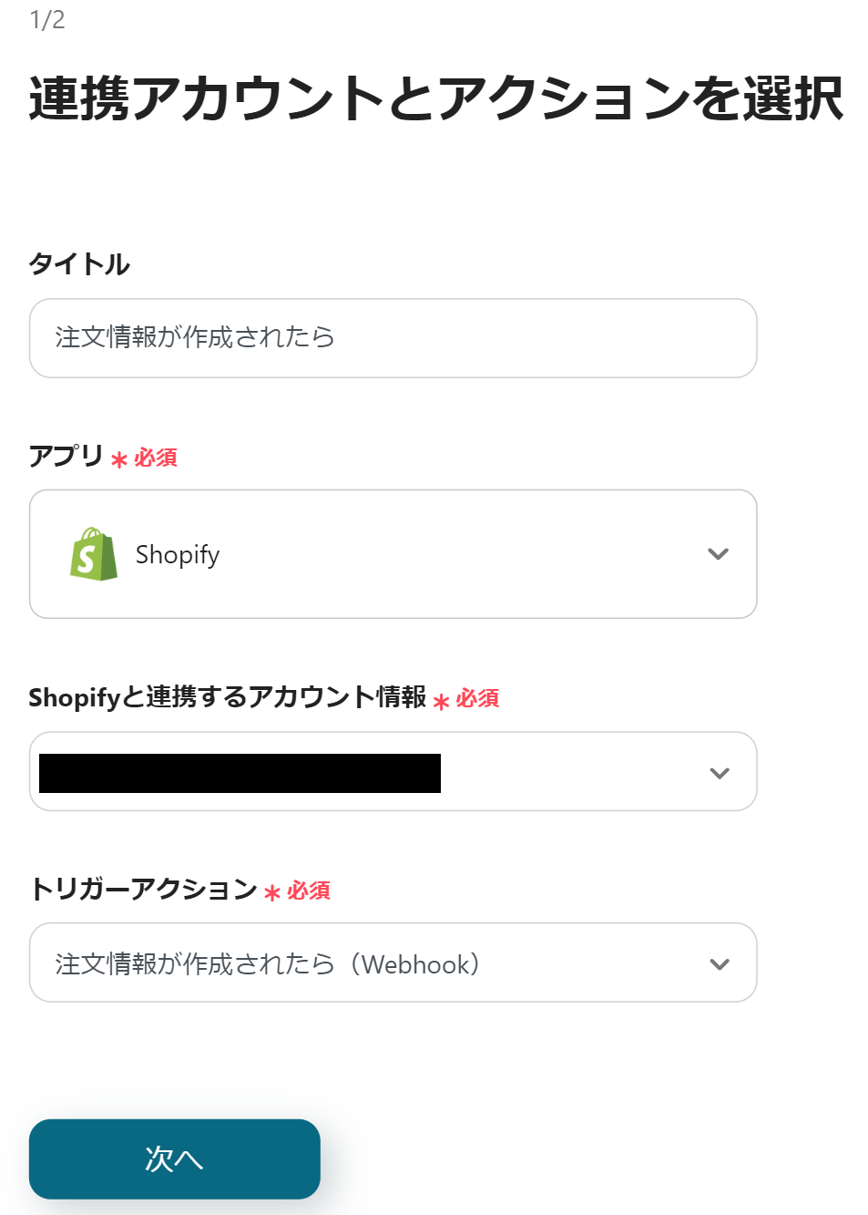 最初にShopifyの設定から行うので、「注文情報が作成されたら」をクリックしましょう。