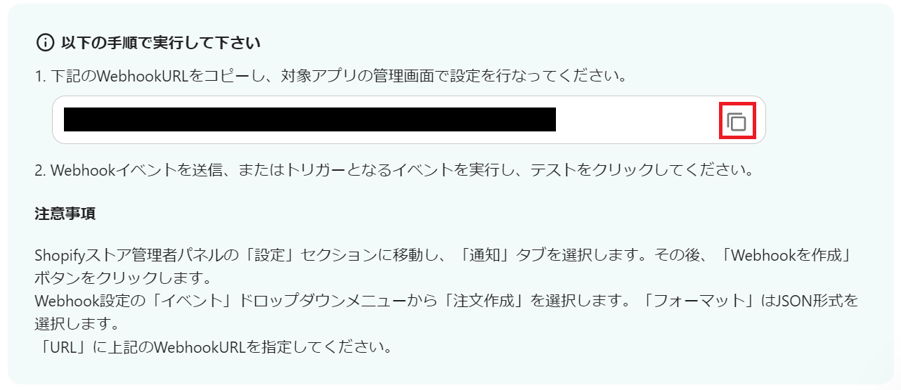 以下の画面が表示されるので、赤枠をクリックし、WebhookURLをコピーします。
