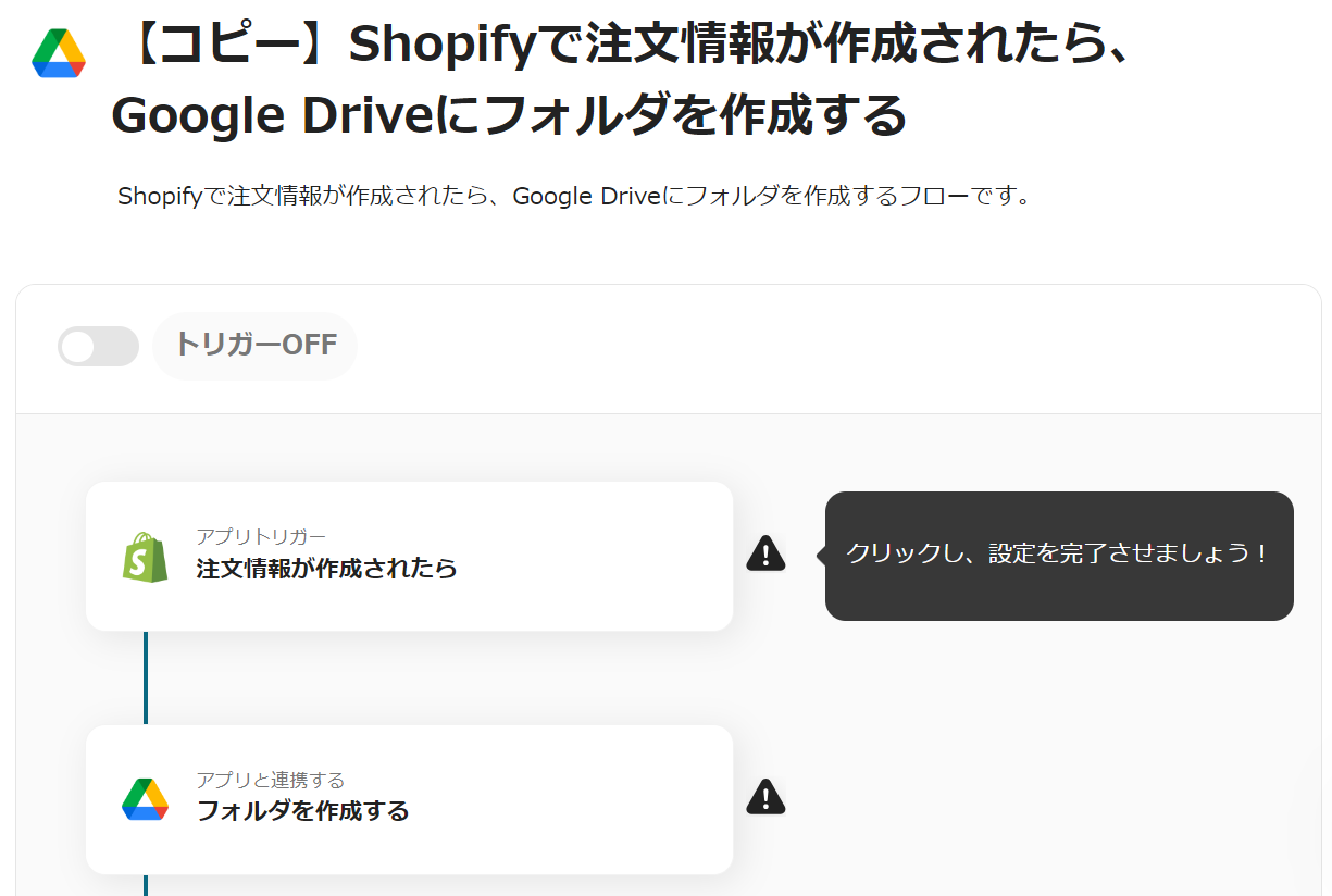 今回は「Shopifyで注文情報が作成されたら、Google Driveにフォルダを作成する」という以下のテンプレートの設定をご紹介します。