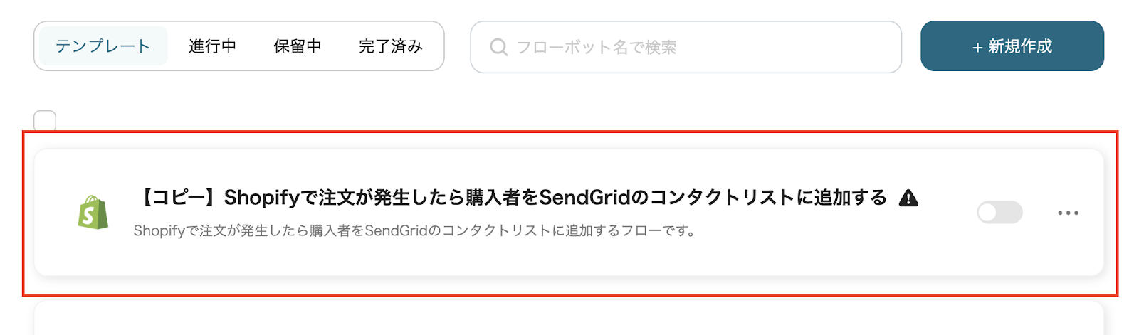 では、「Shopifyで注文が発生したら購入者をSendGridのコンタクトリストに追加する」のテンプレートを使ったフローボットを作成していきましょう。