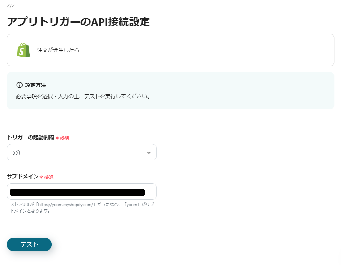 サブドメインを入力したら「テスト」をクリックして、アウトプットを取得します。