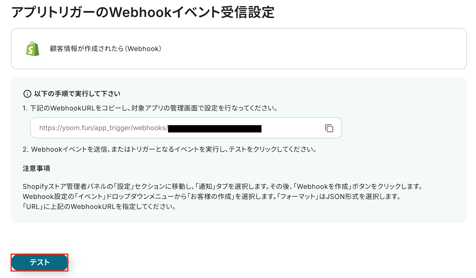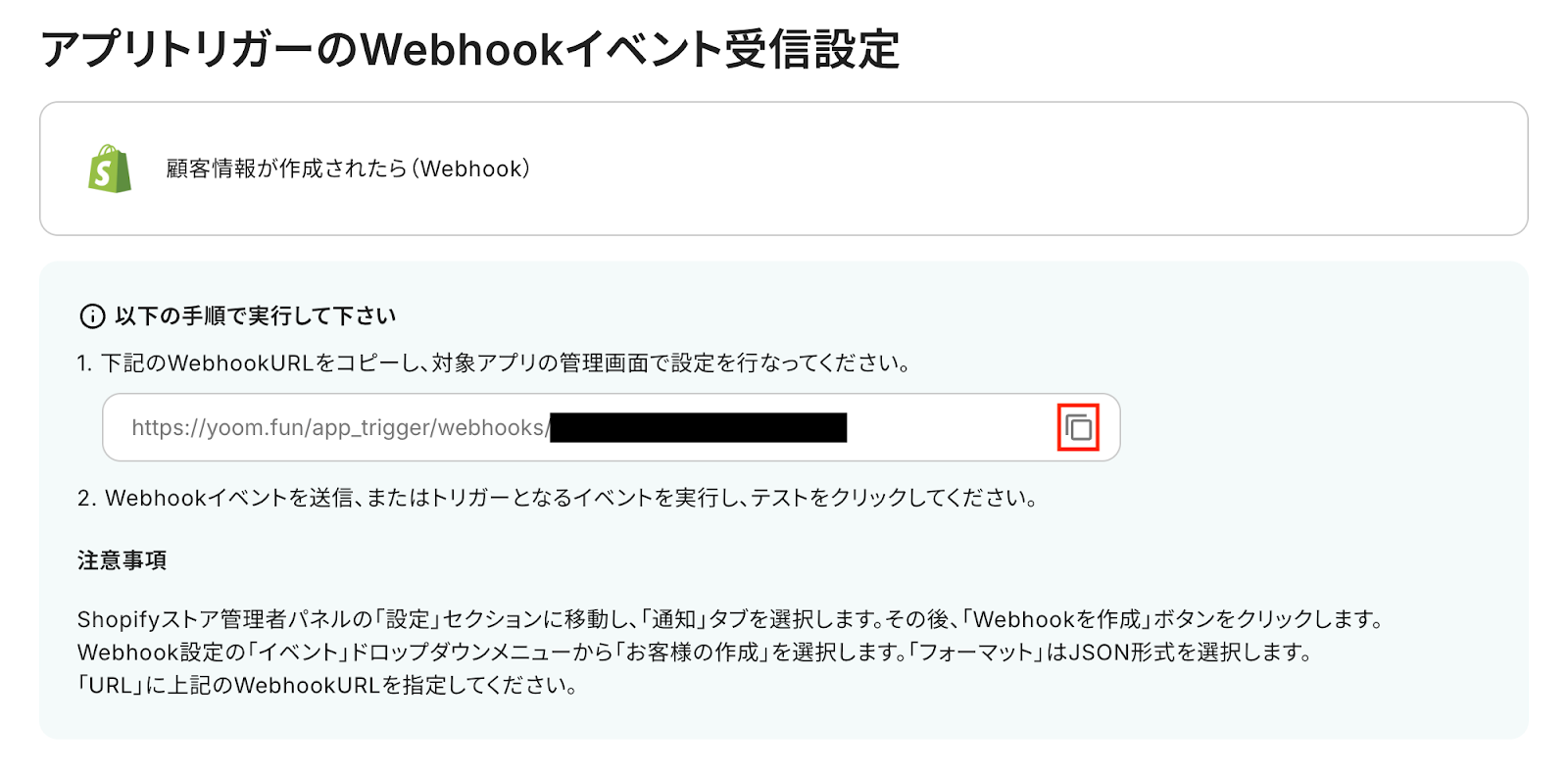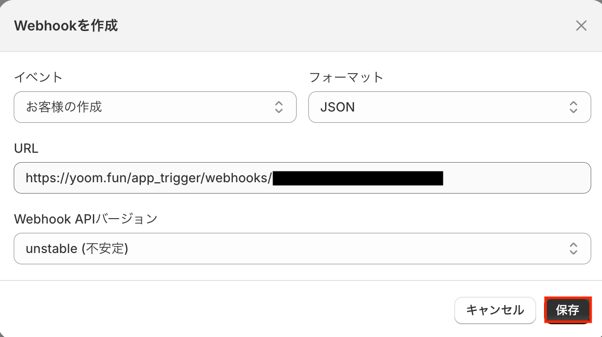 この設定により、顧客の作成などのイベントが発生した際にその内容がWebhook経由で自動的に通知され、Yoom側で処理を開始できるようになります。