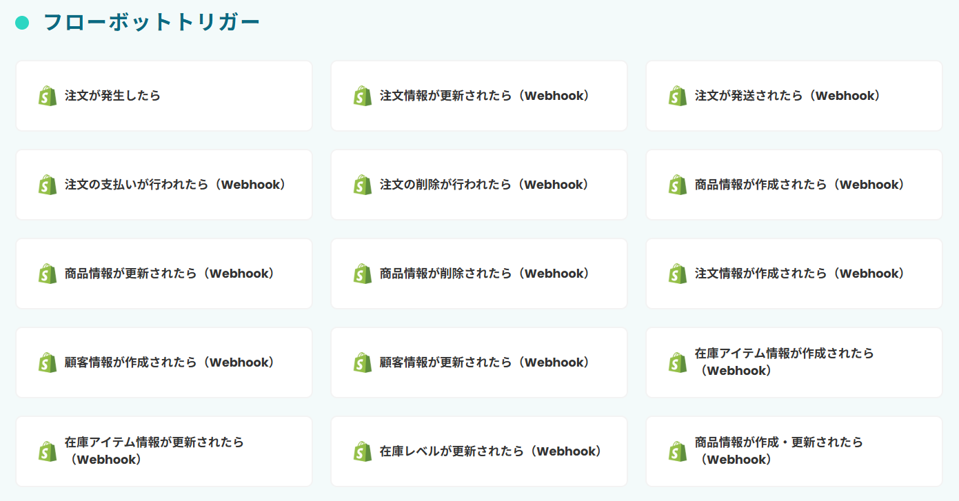 ・Shopifyはチームプラン・サクセスプランでのみご利用いただけるアプリとなっております。フリープラン・ミニプランの場合は設定しているフローボットのオペレーションやデータコネクトはエラーとなりますので、ご注意ください。
