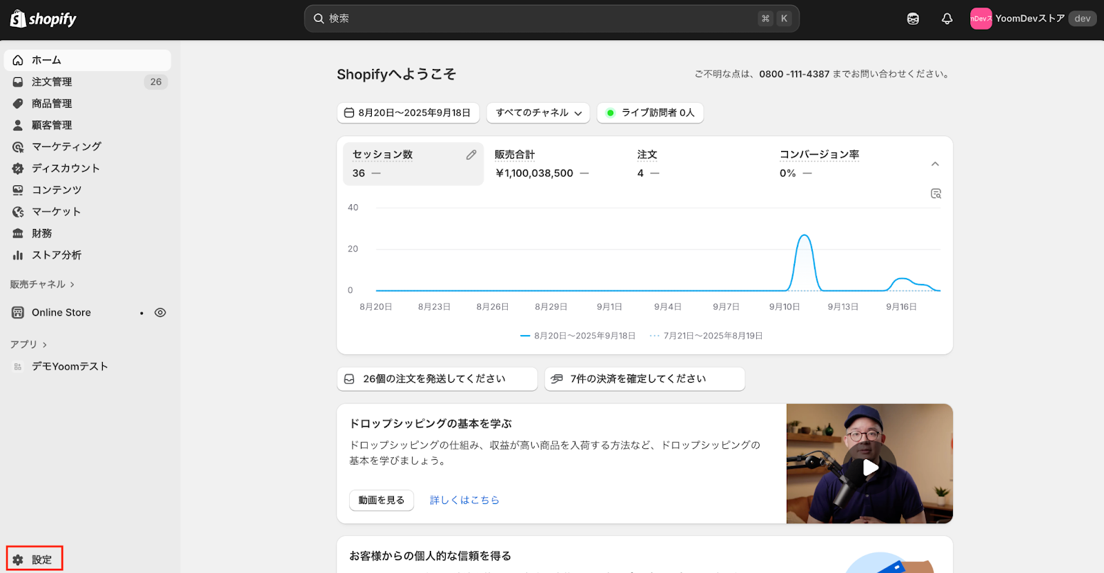 Shopifyストア管理者パネルの「設定」セクションに移動します。