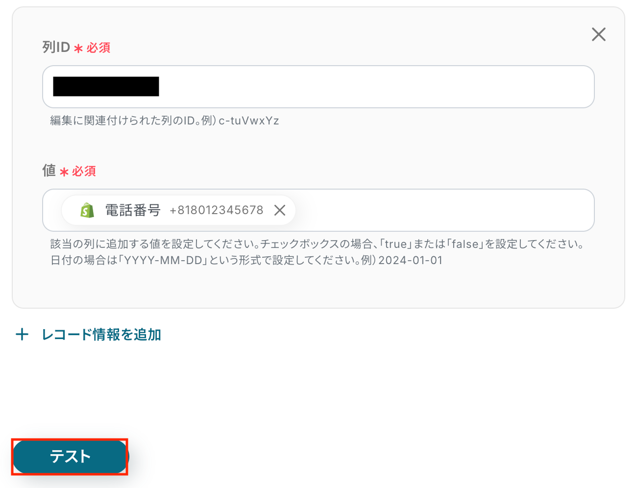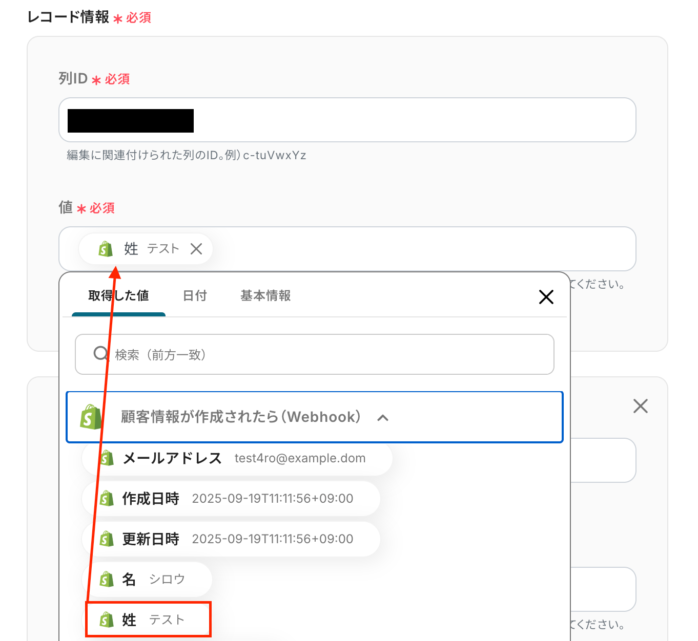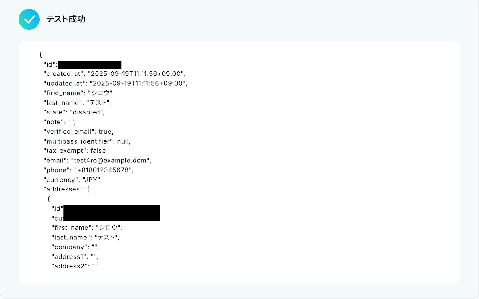 「テスト」をクリックして、作成した顧客情報が正しくWebhookイベントとして取得されるか確認しましょう。