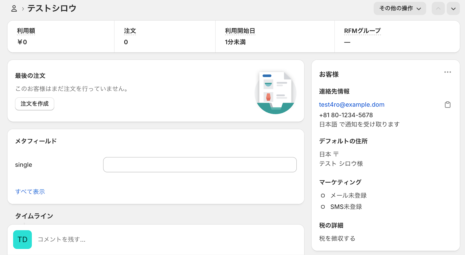 Webhook URLの設定が完了したら、事前準備として連携させるShopifyアカウントで顧客情報を作成しましょう。