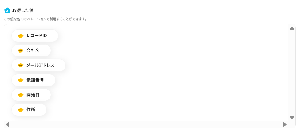 テストが成功した場合は、アウトプット(取得した値)を取得できます。実際の設定では、各項目に具体的な値が反映されます。