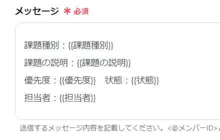 ・メッセージ:任意のメッセージを入力します。以下のように①で取得した値を埋め込むことも可能です。(アウトプットを埋め込む)