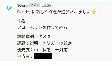 Backlogに課題が追加されたら、追加された課題の内容をSlackに通知するフローです。