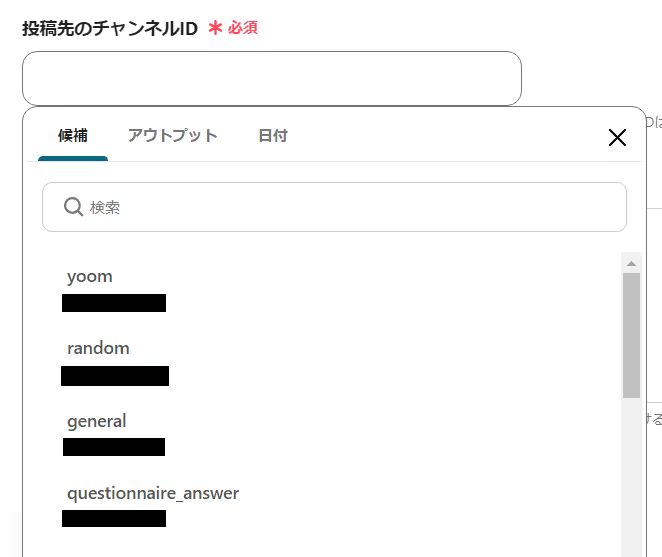 ・投稿先のチャンネルID:欄をクリックし、表示された候補から送付したいチャンネルを選択します。