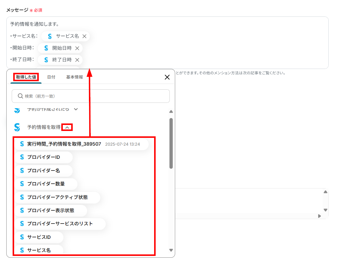 これにより、予約ごとに変わる情報をメッセージへ動的に反映できます。
