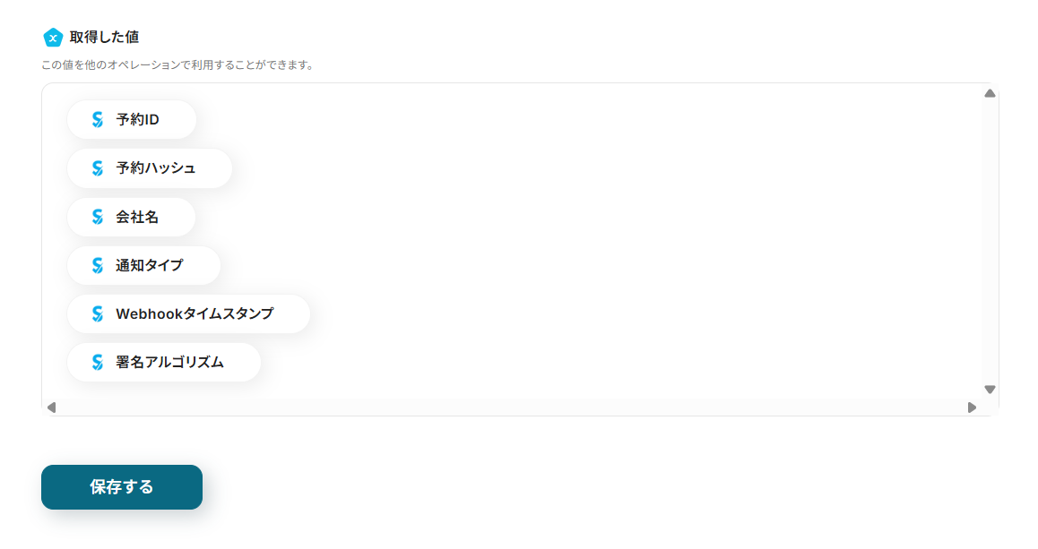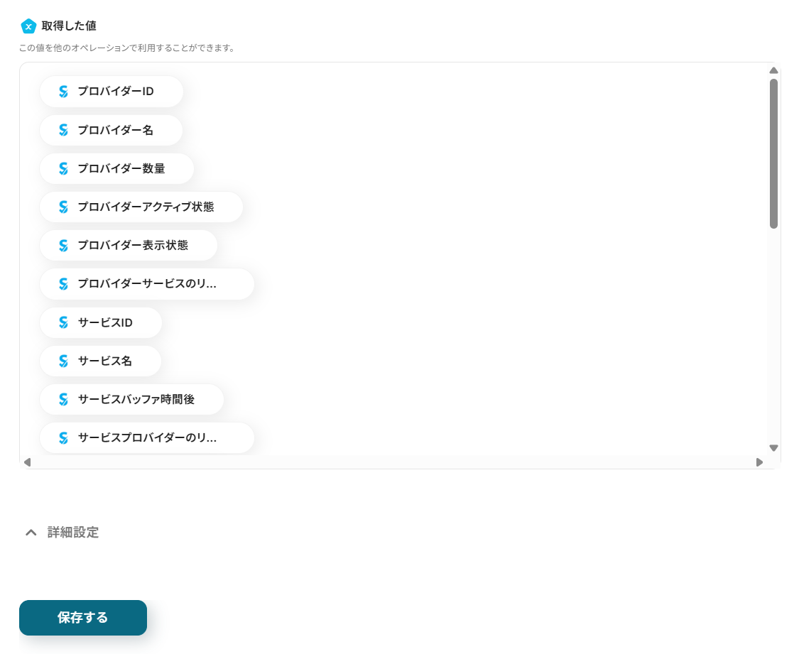 テストが成功すると、予約の詳細情報が取得されるので、確認して保存します。