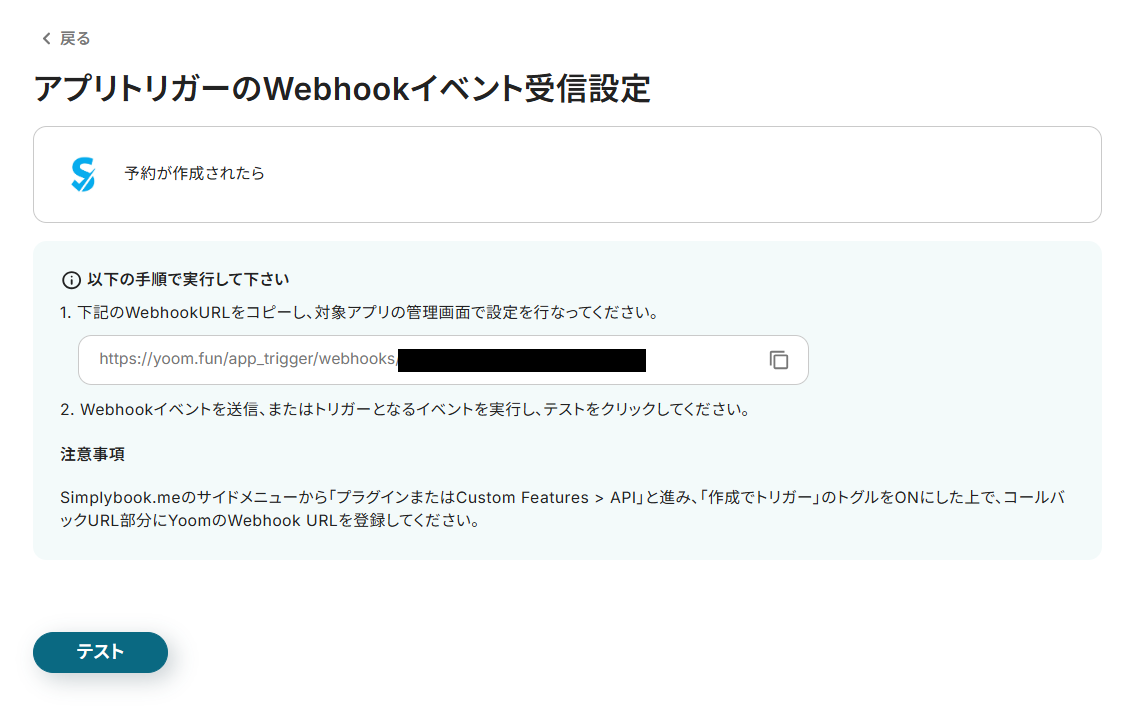 WebhookURLをコピーし、枠下の注意事項を参考にしてSimplybook.meに設定します。