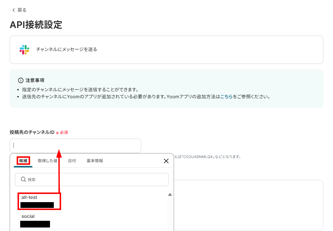 投稿先のチャンネルIDを候補から設定します。