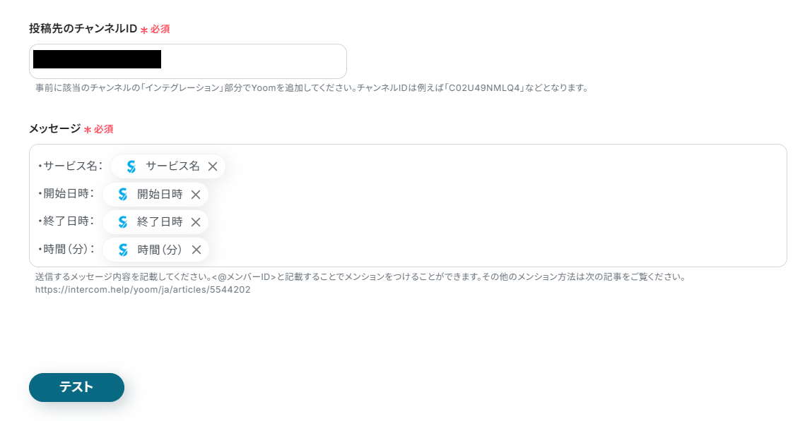 その後、Yoomに戻り「テスト」をクリックしましょう。