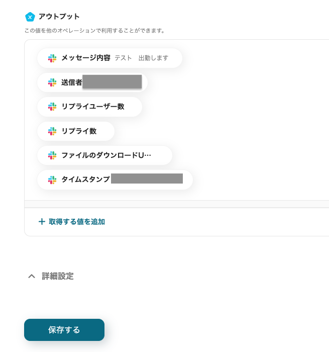 アウトプットに表示されている取得情報を確認し「保存する」をクリックしてください。