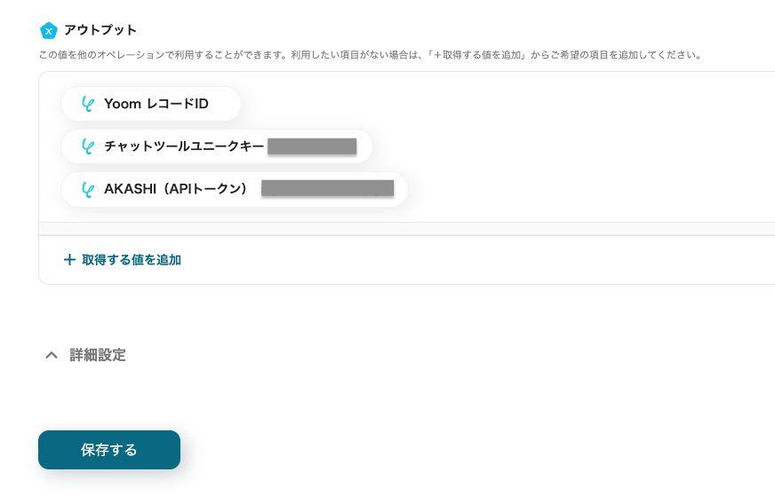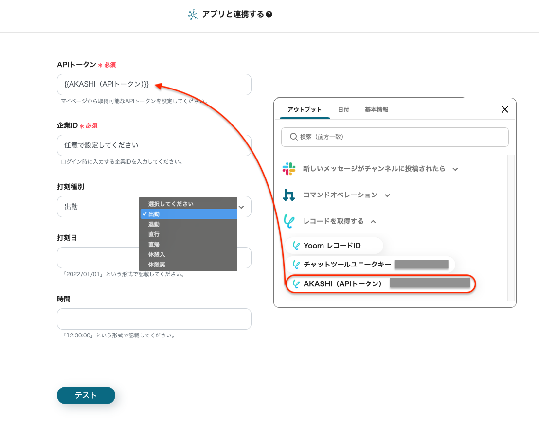 「APIトークン」は、欄をクリックし、表示された候補からYoomのデータベースに登録されているAKASHIのAPIトークンを選択してください。