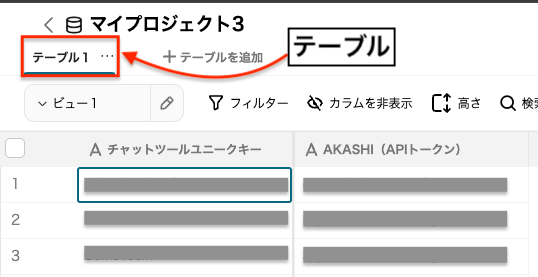 該当のデータベースをクリックすると、画面上部に「テーブル」が表示されます。