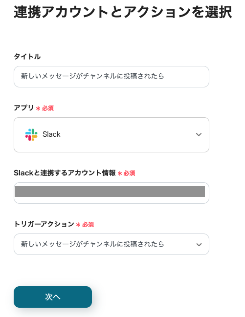 タイトルは自由に編集できますが、トリガーアクションは変更せず、「次へ」をクリックしてください。