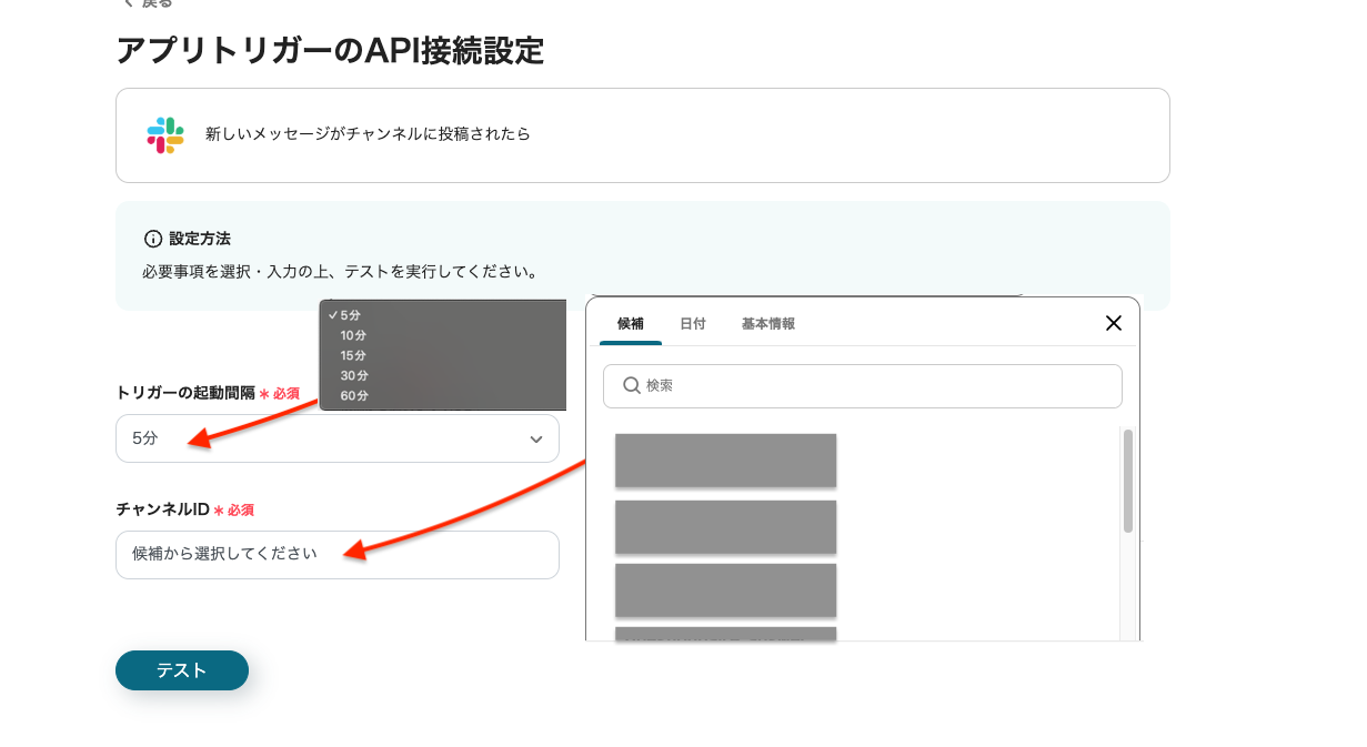各項目を設定し終えたら、Slackで「出勤します」等のメッセージを送信した後、「テスト」をクリックしましょう。