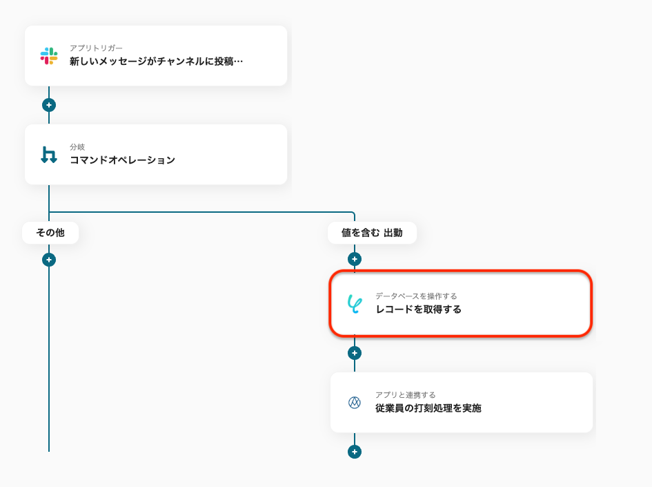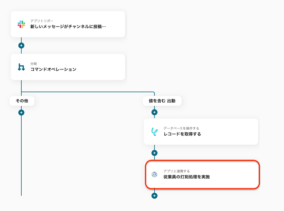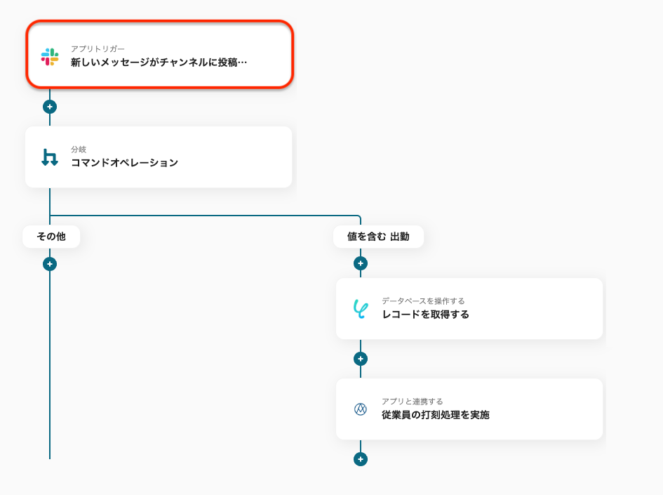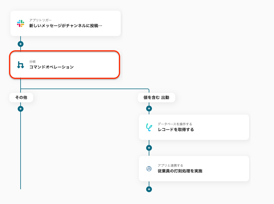 なお、この分岐設定や、この後設定するAKASHIのアクション内容をカスタマイズすることで、退勤や休憩の打刻にも対応することができます。