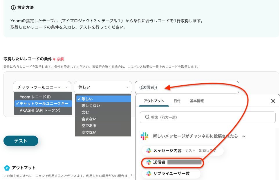 今回は画像のように、Yoomのデータベースに登録したチャットツールユニークキーと送信者IDが等しい、という条件を設定しました。