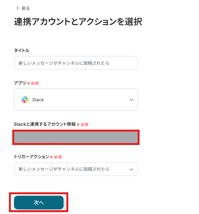 連携アカウントとアクションを選択する画面では、今回連携するSlackのアカウントで間違いないかを確認し、「次へ」をクリックします。