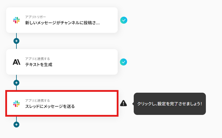 このワークフローを活用すれば、Slackへの投稿をきっかけにAnthropic(Claude)が内容に適した返信文を自動で生成し投稿します。