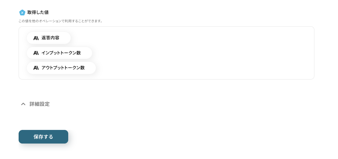 こちらもテストして、取得した値に返答内容などが反映していたら『保存する』を押します。