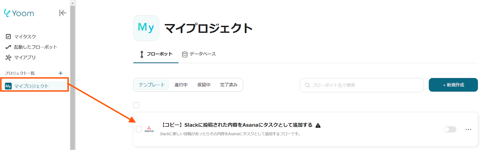 ここからは、Yoomのテンプレートを使って、【Slackに投稿された内容をAsanaにタスクとして追加する】という連携フローを設定していきます。